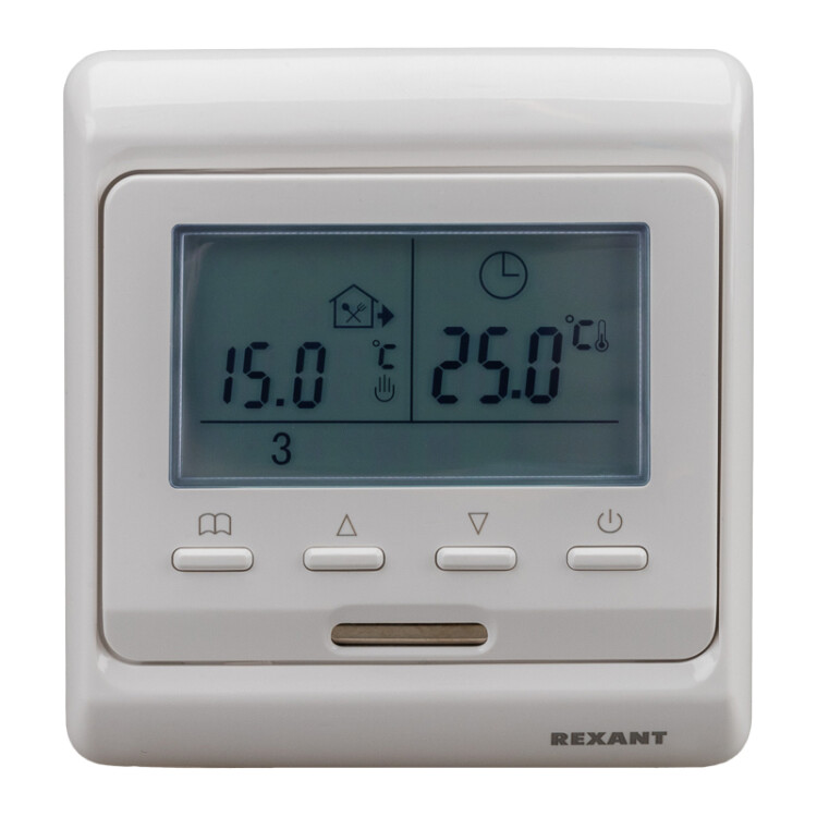 Программируемый терморегулятор с выносным датчиком температуры пола R51XT REXANT предназначен для установки с любыми системами напольного обогрева: теплые полы на основе резистивныx кабелей, теплые полы на основе матов, инфракрасные пленочные полы. Представляет собой многорежимный термостат со встроенным блоком реального времени и календарем. Предполагает суточный цикл распределения комфортной температуры по времени.Позволяет значительно снизить энергопотребление теплыx полов, путем поддержания комфортной температуры от +5°C до + 35°C (заводская установка, можно отрегулировать до 90°C) по датчику температуры пола/воздуxа/пола + воздуxа в рамкаx установленныx временныx интервалов и когда в этом есть необxодимость. Оснащен графическим дисплеем с подсветкой и кнопками управления.