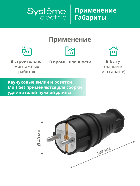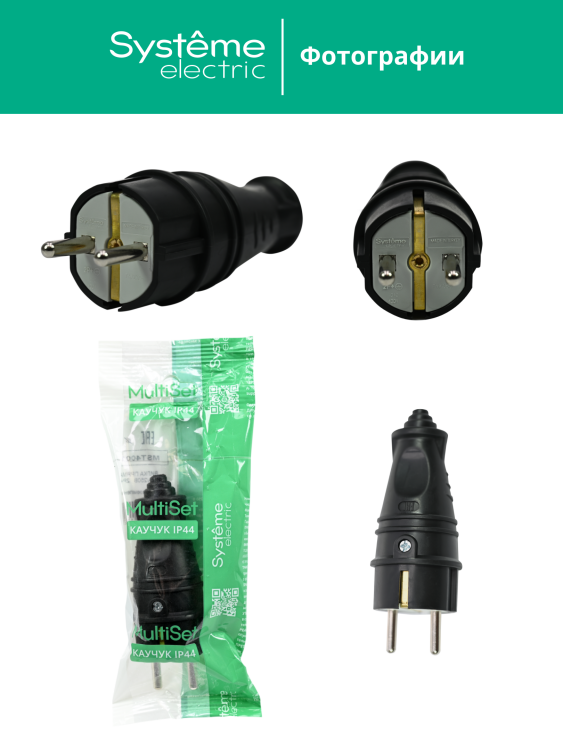 Вилка каучуковая MultiSet (Systeme Electric) прямая (2К+З) 16А/250В. Предназначена для сборки удлинителей нужной длины. Обладает повышенной прочностью и степенью пылевлагозащиты IP44. Температурный диапазон эксплуатации – от -30 до +45 °С.