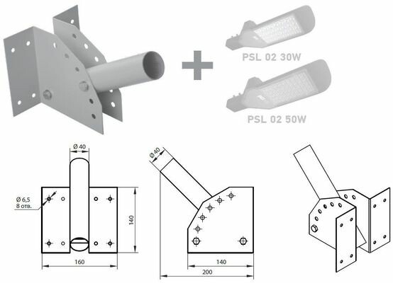 Установка. Держатель для уличного светильника PSL (РКУ) D401.5 (на стену) с переменным углом наклона (0, 15, 30, 45, 60, 75) предназначен для крепления уличных светильников типа РКУ / ЖКУ к несущим поверхностям. Кронштейн под бандажную ленту PSL (РКУ) D401.5 (на столб) с углом наклона 15 предназначен для установки уличных светильников типа РКУ / ЖКУ на опоры, столбы с помощью бандажной (монтажной) ленты или на плоские поверхности с помощью саморезов, скоб. Конструкция. Изготовлен из стального листа толщиной 1,5 мм. Диаметр посадочной трубы 40 мм. Конструкция кронштейна позволяет регулировать угол установки светильника. Способ крепления при помощи анкерных болтов.