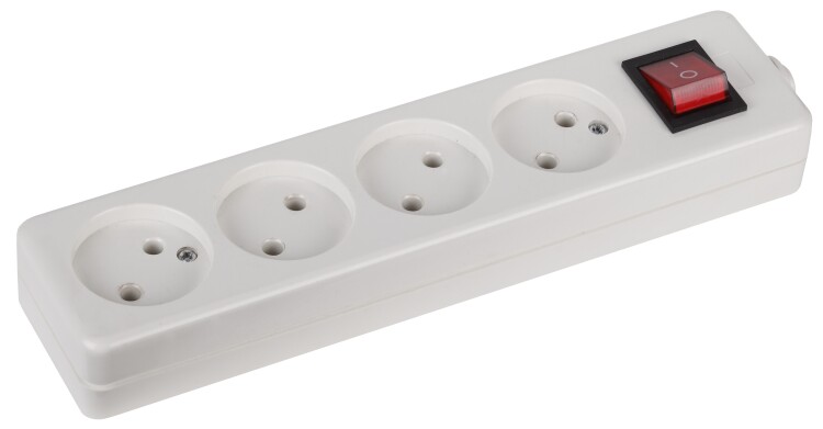 Колодка ЭРА K-4s. На 4 розетки без зазeмления с выключателем. Максимальная мощность 10 А/2200. Для кабеля сечением до 2x1мм2.