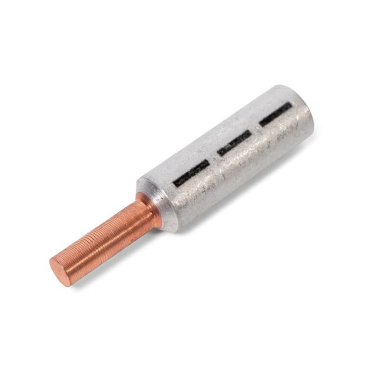 Предназначены для оконцевания опрессовкой алюминиевых кабелей и проводов и последующего подключения их к выводам автоматических выключателей и прочим устройствам с ограниченной шириной контактной клеммы..Материал: электротехнический алюминий марки АД1 и медь марки М1.Рабочее напряжение: до 35 кВ.Медная и алюминиевая части наконечника соединены между собой методом фрикционной сварки и обеспечивают контакт металлов на молекулярном уровне.Обеспечивают прямое подключение проводов СИП к автомату без использования дополнительных приспособлений.На трубной части наконечников нанесена разметка, определяющая местоположение и количество опрессовок.