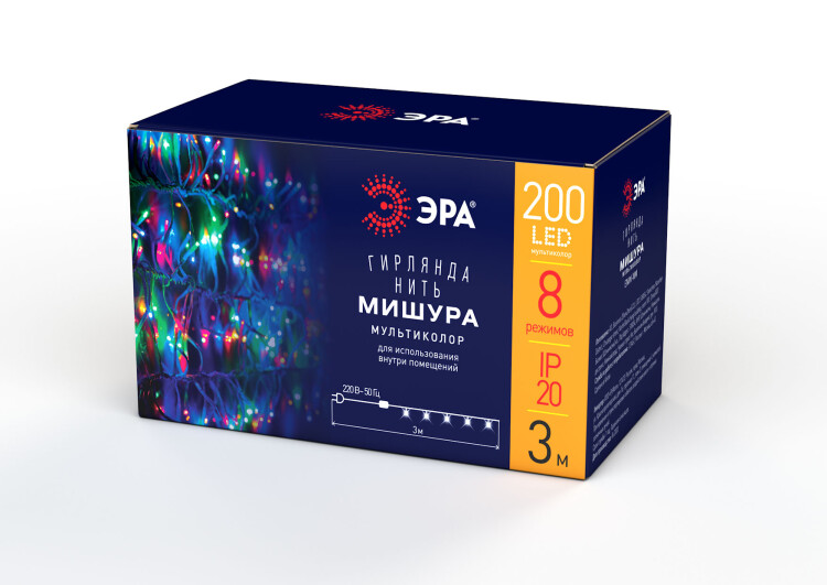Новогодняя гирлянда-нить ЭРА ENIN - WM (арт. Б0047972) современного дизайна с миниатюрными лампочками разных оттенков. Провод белого цвета идеально подходит для зимних праздников, ассоциируясь со снегом. Такая гирлянда отлично смотрится на ёлке, создавая эффект припорошенного снегопадом праздничного дерева. Складывается впечатление, что дом или общественное пространство украшены светящейся мишурой, так как многочисленные светодиоды расположены на кончиках тонких проводов. Свет получается объёмным и "пушистым". Для высокой яркости этой гирлянде не пожалели светодиодов - их здесь 200 штук. Общая длина красивой и практичной гирлянды ЭРА - 3,9 метра. Первая лампочка - через 1,5 метра от вилки. Создавать уникальную праздничную атмосферу можно с помощью 8 разных режимов.