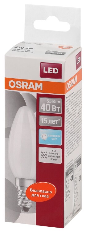 Лампа светодиодная OSRAM LED Star B, 470 лм, 5,5Вт (замена 40Вт), 4000K (нейтральный белый свет). Цоколь E14, колба B, угол пучка 200. Исполнение колбы матовое, пластик. Напряжение питания 220-240В. Товар сертифицирован
