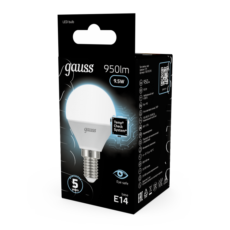 Gauss Лампа Шар 9.5W 950lm 4100K E14 LED