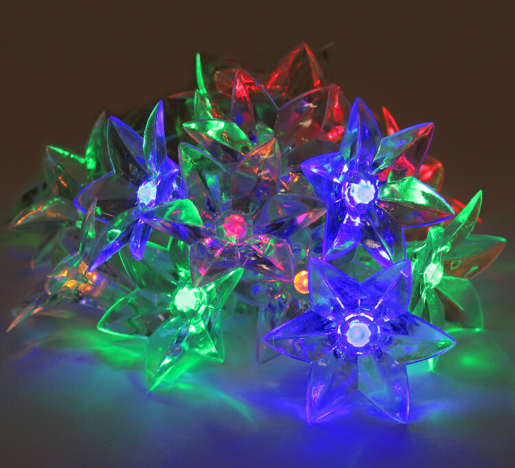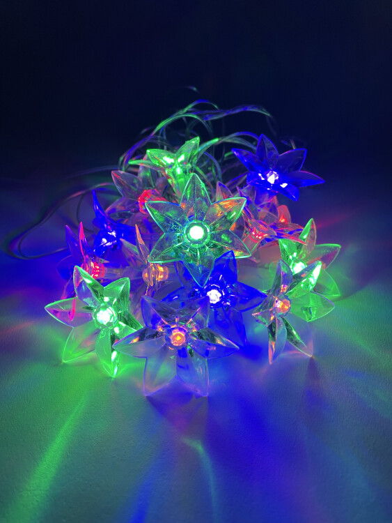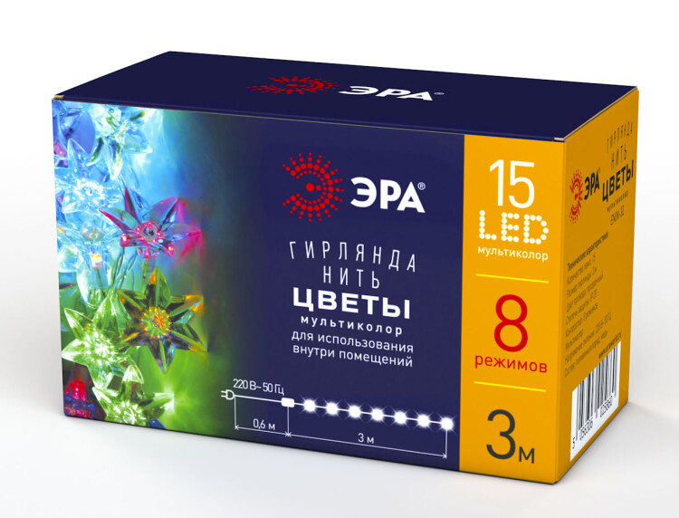 Новогодняя светодиодная гирлянда ЭРА (арт. Б0041896) с необычным исполнением ламп - они представляют собой разноцветные цветы-звёзды. На полупрозрачном проводе длиной 3 метра расположены 15 ламп с яркими экономичными светодиодами. Плафоны в форме цветков изготовлены из ударопрочного прозрачного пластика. Гирлянда выглядит оригинально и светит разнообразно - доступны 8 режимов под любое настроение: от тихого предновогоднего вечера в семейном кругу до шумной вечеринки в компании гостей. Украсите ваш дом, офис или общественное пространство быстро и красиво.
