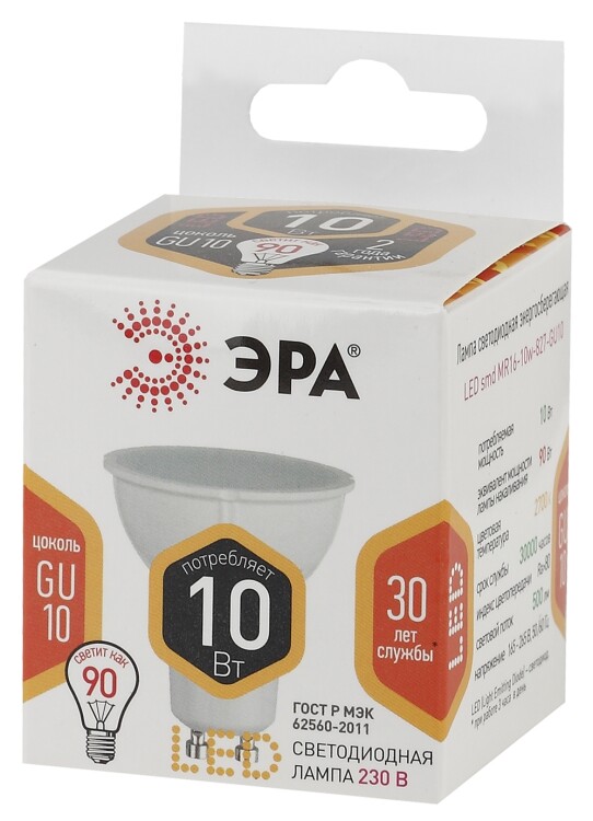 ЭРА Лампа светодиодная STD LED MR16-10W-827-GU10 10Вт софит теплый белый свет GU10