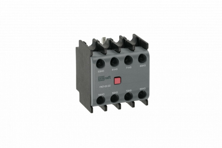 Приставка контактная серии ПКЛ-02-40 для контакторов КМ-102 DEKraft; кол-во контактов - 4НО; ном.ток 10 А; ном.напряжение до 690 В; установка с лицевой стороны; степень защиты IP20. Приставки контактные предназначены для увеличения количества вспомогательных контактов контактора. Контактные приставки механически соединяются с контакторами и фиксируются при помощи защелки. Приставка подходит для использования с контакторами других производителей.