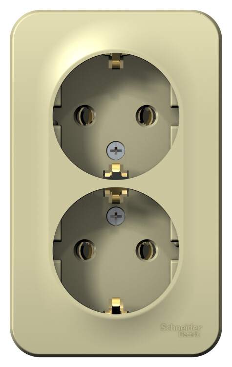 Розетка Systeme Electric (ранее Schneider Electric) BLANCA (открытой установки, цвет бежевый) двухместная с заземлением без шторок, с изолирующей пластиной подходит для сетей 250 В, на ток 16 А. Заземляющий контакт обеспечивает дополнительную защиту от удара электрическим током. При наличии заземления электрический потенциал уходит в землю, защищая человека. Корпус изделия выполнен из ABS-пластика.