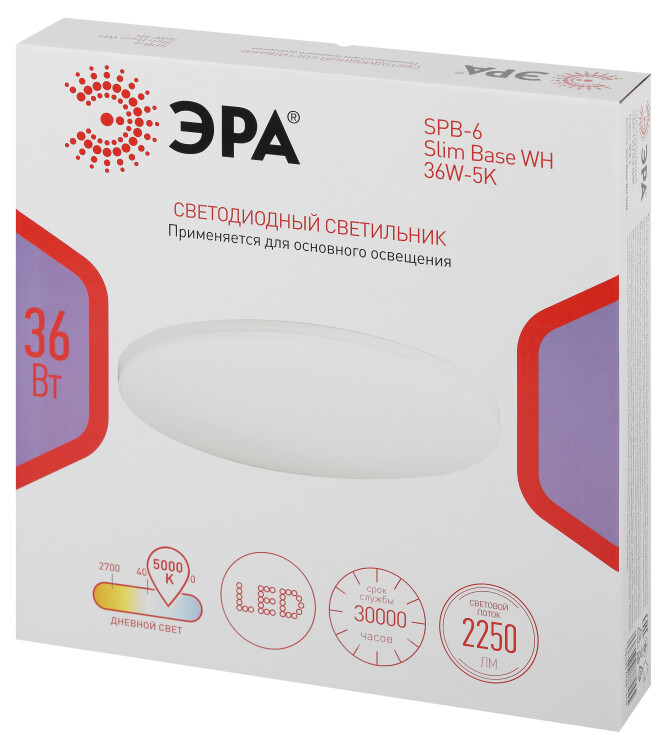 Светодиодный светильник ЭРА SPB-6 Slim Base WH 36W-5K – современное решение для общего освещения жилых и коммерческих помещений.