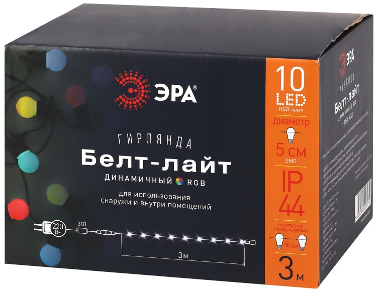 Уникальная для российского рынка гирлянда ЭРА Белт-лайт ERABL-MK3. Внутри каждой лампочки несколько RGB-светодиодов, которые светят разными цветами, плавно меняя оттенки. В многоцветной новогодней иллюминации мы привыкли видеть несколько базовых ярких цветов. Здесь же целая палитра, состоящая преимущественно из нежных пастельных оттенков. Праздничная гирлянда ЭРА "Белт-лайт" - современный высокотехнологичный аналог традиционных гирлянд-шариков. Поможет стильно и душевно украсить дом, сад или общественное пространство, вызовет приятные ностальгические эмоции, удивит качеством и удобством в использовании. Подходит для применения внутри и снаружи помещений. Колбы не из хрупкого стекла, а из устойчивого к механическим воздействиям и низким температурам пластика. Лёгкие и прочные плафоны не разобьются при транспортировке, использовании и хранении. Надёжный каучуковый провод сохраняет форму и гибкость при низких уличных температурах. Гирлянды ЭРА "Белт-лайт" можно соединять в длинные цепи - до 4 гирлянд в цепи. Заглушки и коннекторы герметичны. В каждый набор входит комплект для подключения и соединения. Создавайте праздничное настроение вместе с ЭРА.