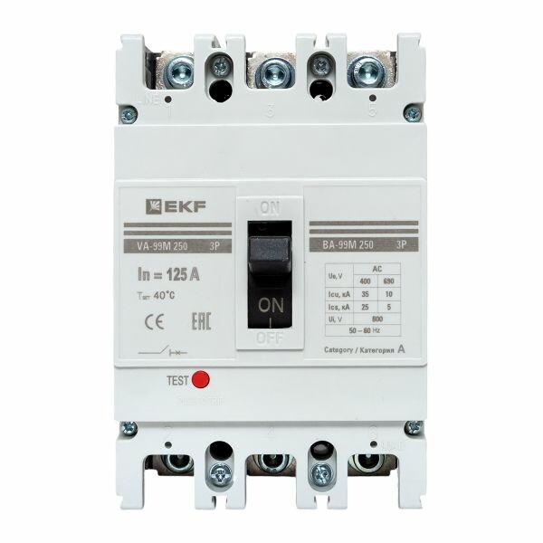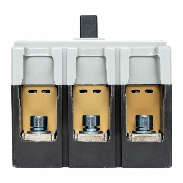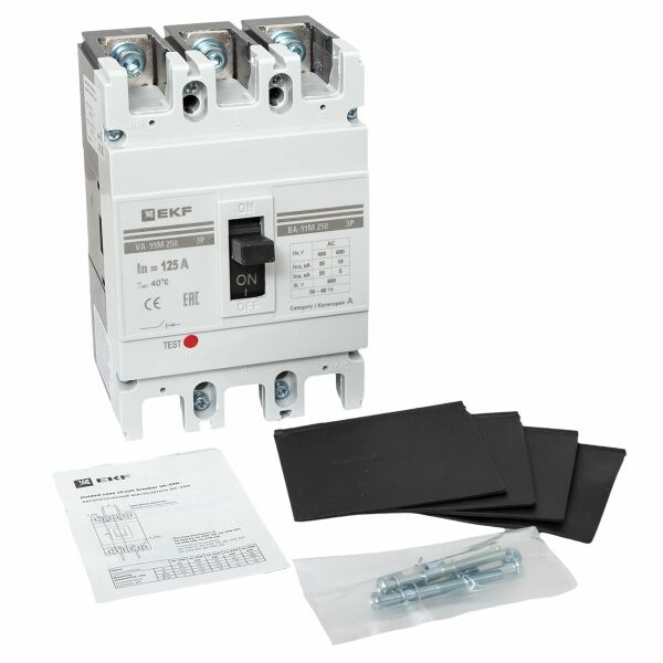 Выключатель ВА-99М выполнен в виде моноблока и состоит из основания и крышки с фальшпанелью, в которой имеется окно для рукоятки управления и толкатель кнопки «Тест» - проверки механизма отключения выключателя. Основание выполнено из термостойкой пластмассы, не поддерживающей горение и являющейся несущей конструкцией для присоединительных зажимов, неподвижных и подвижных контактов с системой дугогашения, механизма управления, блока защиты от сверхтоков. Крышка закрывает все подвижные элементы механизма управления и внутренние токоведущие части.