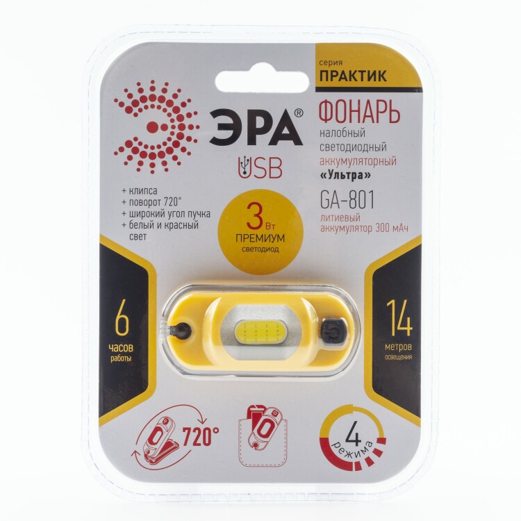 Фонарь налобный с аккумулятором для охоты и рыбалки яркий мощный Эра GA-801 "УЛЬТРА" серии "Практик" идеально подходит для бытовых и практических задач. Фонарик налобный для рыбалки туристический бытовой удобно использовать для работы в доме, в саду или в любой ситуации, когда необходим дополнительный источник света и свободные руки. Фонарь питается от аккумулятора на 300 мАч. Полной зарядки хватает на 6 часов непрерывной работы, а заряжается аккумулятор от USB. Фонарик может работать в 4 режимах, а также светить белым и красным светом. В фонаре используется мощный светодиод на 3Вт премиум класса. Он ярче и мощнее обычных диодов, светит ровным светом. Дальность света 14 метров. Также фонарь имеет широкий угол светового потока и оборудован клипсой, которая позволяет прикрепить его на одежду, к рюкзаку или на кепку. Шарнир позволяет вращать фонарь на 720 градусов.
