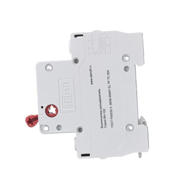 Выключатель-разъединитель серии ВН-102 Dekraft; 1P; номинальный ток 40 А; установка – на DIN-рейку; установочное положение - любое. Выключатели-разъединители применяются для ручного включения/отключения сетей напряжением до 400 В. Специальные мостиковые контакты обеспечивают надежный разрыв цепи; они полностью исключают возможность перекрытия дугой по изоляции. Усиленная рукоятка управления обеспечивает большое количество включений/отключений.