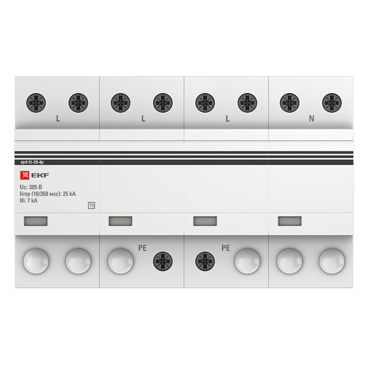 УЗИП Тип 1 (класс 1) применяются для защиты от больших импульсных перенапряжений (удар молнии, мощный бросок напряжения в режиме КЗ). Устанавливаются в местах возможного прямого попадания молнии в ВЛ электропитания или в качестве 1-ой ступени защиты в системе внешней молниезащиты объекта. Испытание и нормирование УЗИП класса I осуществляется импульсным током Iimp – 10/350 мкс, номинальным разрядным током In – 8/20 мкс, импульсным напряжением – 1,2/50 мкс. Устанавливаются УЗИП класса 1 к примеру, в щит учета на опоре, снаружи дома (до счетчика), в главном распределительном щите объекта (ГРЩ) или во вводном-распределительном устройстве (ВРУ).