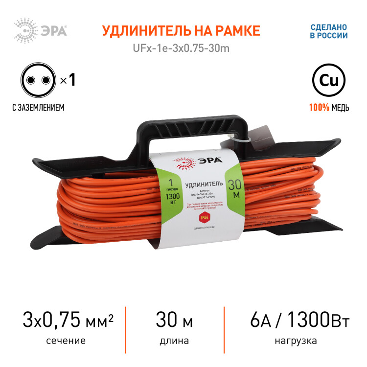 Удлинитель силовой на рамке UFx-1е-3x0.75-30m с заземлением, ПВС 3х0,75м2, 1 розетка, 30м, степень защиты IP20. Мощность 6А/1300Вт. Используется для работы на строительных площадках или дачных участках. Удобен при работе с приборами находящимися удаленно от стационарной розетки. Например, газонокосилки, электрические, пилы, триммеры или электродрели. Провод в удлинителях Эра сделан из 100% меди, что делает его абсолютно пожаробезопасным. Рама-полипропилен.