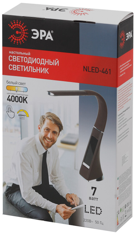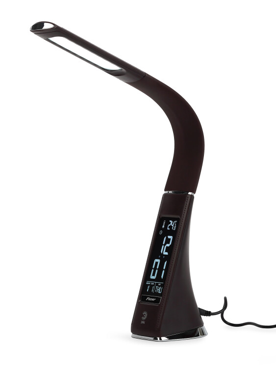 Настольный светильник ЭРА NLED-461-7W-BR со светод иодами (LED) в качестве источников света в дизайне "под кожу". Оснащен сенсорным управлением, есть регулировки яркости освещения - 3 уровня. Главное преимущество светильника - ЖК дисплей с функциями часов, будильника, календаря и термометра. Сенсорная кнопка с обратной стороны стойки обеспечивает опцию выбора яркости дисплея с возможностью его выключения. Высота плафона регулируется гибкой стойкой, направление света регулируется поворотом плафона в любом направлении.