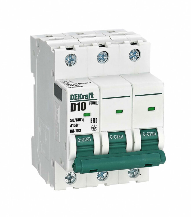 Автоматический выключатель серии ВА-103 NEW DEKraft; 3P; номинальный ток 10 А; характеристика D; отключающая способность 6 кА, что позволяет использовать аппараты в качестве вводных. 5 монолитных заклепок повышают прочность корпуса аппарата. Окошко-индикатор всегда показывает состояние контактов вне зависимости от положения рукоятки управления. Боковые каналы охлаждения повышают стабильность работы при высоких температурах окружающей среды. Есть возможность установки дополнительных аксессуаров с левой стороны устройства. Аппарат на 100% совместим с корпусами и оболочками DEKraft, Systeme Electric.
