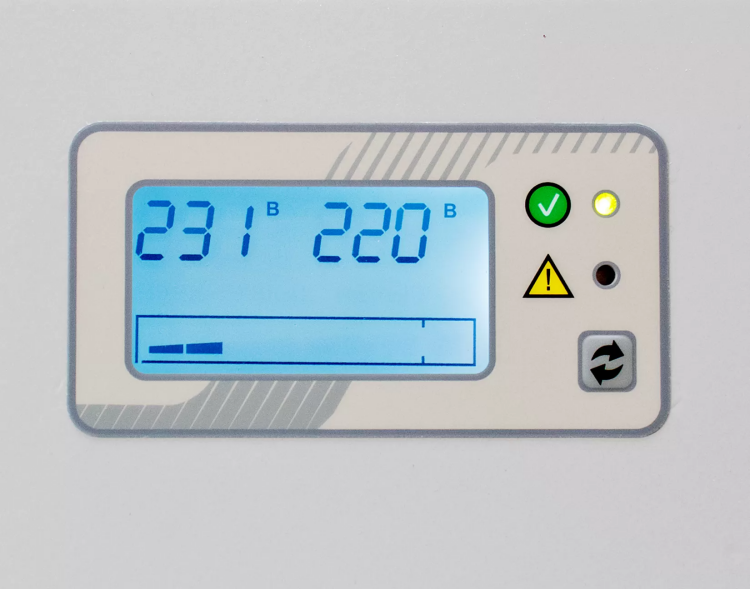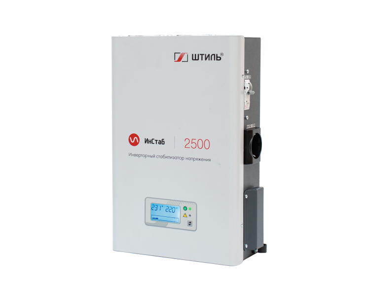 Инверторный стабилизатор напряжения Штиль IS2500 – устройство нового поколения, принцип работы которого основан на технологии двойного, бестрансформаторного преобразования энергии. Он предназначен для защиты от повышенного и пониженного входного напряжения однофазных электроприборов с потребляемой мощностью не более 2500 ВА/2000 Вт, например, газовых котлов, телевизоров, холодильников, микроволновых печей, электроинструментов. Стабилизатор выполнен в универсальном конструктиве для настенной или настольной установки. Он подключается к сети с помощью клеммной колодки и вводного автомата. Для подключения нагрузки на боковой панели предусмотрены две EURO розетки с заземлением и клеммы. На передней панели расположены ЖК-дисплей и два светодиодных индикатора, которые позволяют контролировать основные параметры входной и выходной сети, состояние и режим работы стабилизатора. Предусмотрена электронная аварийная защита от короткого замыкания, импульсных помех, перегрузки, перегрева и аварии сети.