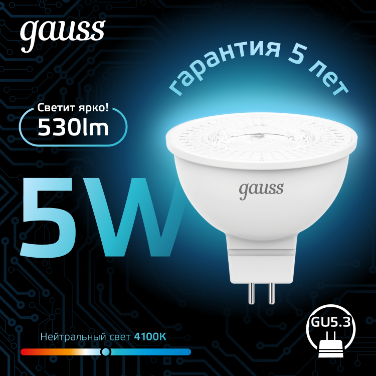 Лаконичная форма, высокий индекс цветопередачи, позволяющий создавать любые дизайнерские эффекты, а также отличные технические характеристики делают лампы Gauss серии MR16 идеальным вариантом для создания как внутреннего, так и уличного освещения. При мощности 5 и 7 Вт данные лампы имеют высокий световой поток 500-630 Лм. Они являются лучшей альтернативой галогенным лампам, аналогам ламп накаливания 35-50 Вт. Данная линейка имеет три цветовые температуры: 3000K, 4100K и 6500K.Светодиодные лампы MR16 отлично смотрятся в интерьерном освещении. Они имеют небольшие размеры, поэтому успешно используются для встраивания в мебель.Лампы с ярким направленным светом идеально подходят для освещения витрин. Именно серию MR16 часто используют для создания качественной подсветки в ювелирных магазинах. Кроме этого, их можно применять в наружном освещении в ландшафтных и тротуарных светильниках