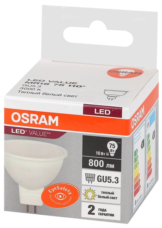 Лампа светодиодная OSRAM LED Value MR16, 800лм, 10Вт (замена 75Вт), 3000К (теплый белый свет). Цоколь GU5.3, колба MR16, угол пучка 110. Исполнение колбы матовое, пластик. Напряжение питания 220-240В. Товар сертифицирован.