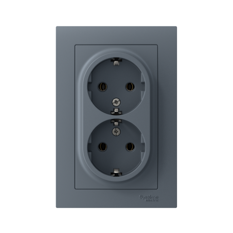 Розетка двойная в сборе Systeme Electric (ранее Schneider Electric) серии AtlasDesign в цвете грифель с заземлением, без шторок подходит для сетей 250 В, на ток 16 А. Заземляющий контакт обеспечивает дополнительную защиту от удара электрическим током. Лицевые детали из качественного ABS-пластика, устойчивого к царапинам и УФ-излучению. Двойная розетка позволяет подключить два устройства в одном месте. Изделие поставляется в комплекте с рамкой того же цвета.