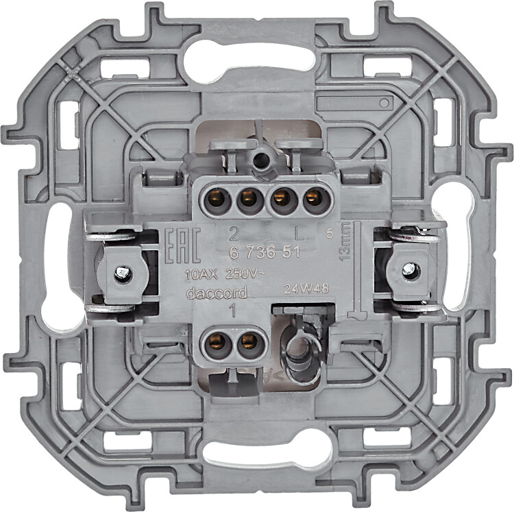 Переключатель одноклавишный скрытого монтажа Legrand/Daccord Inspiria, цвет "Слоновая кость", номинальный ток 10АХ, напряжение ~250В, безвинтовые зажимы. Устанавливается в жилых и общественных помещениях для управления приборами освещения, вентиляции и т.д. Предназначен для управления одной нагрузкой с одного, двух или более мест (совместно с перекрёстными переключателями). Особенности изделия: - Компактный механизм глубиной всего 20 мм без проблем размещается в монтажных коробках малой глубины - Материал клавиши - АБС: обладает высокой ударопрочностью, стоек к выгоранию и загрязнениям - Материал механизма и суппорта - высококачественный поликарбонат: обладает высокой электробезопасностью, термостабильностью и не поддерживает горение - Все токоведущие части выключателя имеют защиту от случайного прикосновения - Безвинтовые зажимы обеспечивают быстрое присоединение и отсоединение проводов с однопроволочными и многопроволочными жилами - Безвинтовые зажимы не требуют обслуживания, гарантируют надежное и долговечное соединение - Удобные широкие толкатели облегчают отсоединение провода - Улучшенная эргономика снижает вероятность искрения при коммутации светодиодных источников света - Ход клавиши короткий, негромкий