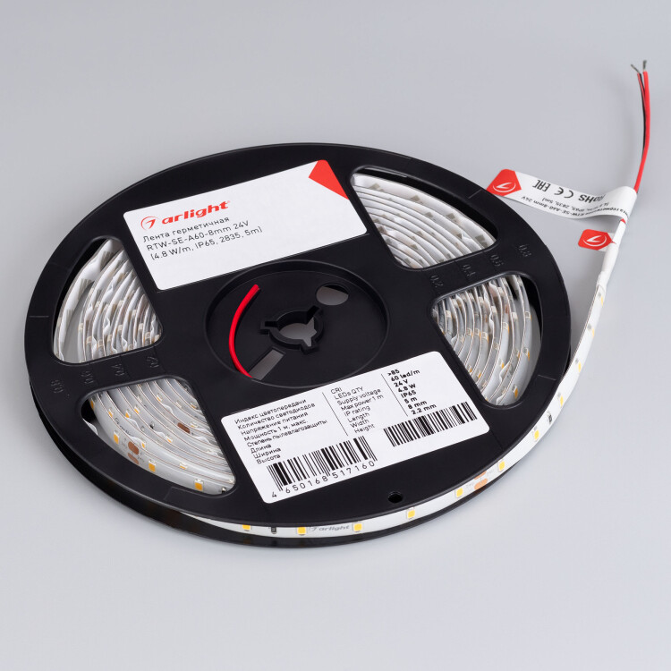 Светодиодная герм етичная лента RTW серии A60, IP65 (SE - силиконовый верхний слой). Светодиоды SMD 2835, 60 шт/м, белая плата шириной 8 мм, скотч 3M. Цвет ДНЕВНОЙ 4000K, индекс цветопередачи CRI>85, угол 120°. Питание 24 В, мощность 4.8 Вт/м (24 Вт на 5 м). Размеры 5000x8x2.2 мм. Мин. отрезок 100 мм, 6 светодиодов. Цена за 1 м. Кратность заказа поставщику: 5 м.