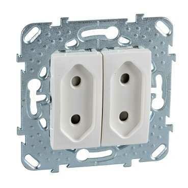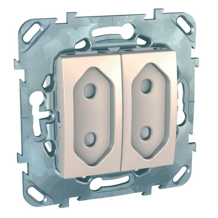 Розетка двухмодульная Schneider Electric UNICA (бежевый) без заземления, со шторками, с винтовыми зажимами предназначена для сетей до 250 В на ток до 10 А.