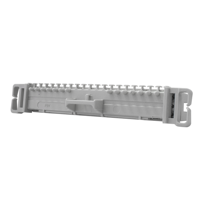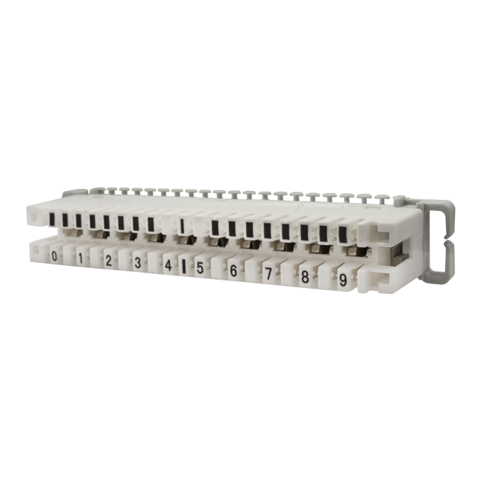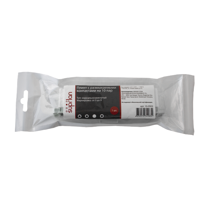 Телефонный плинт с размыкаемыми контактами на 10 пар предназначен для построения сетей телефонной связи и может передавать сигналы как аналоговых, так и цифровых телефонных аппаратов. Допускает передачу данных иной низкоскоростной аппаратуры. Представляет собой его основную коммутационную единицу телефонного кросса. Конструктивно это изделие включает в себя следующие основные элементы: IDC-контакты для подключения к ним линейных и станционных кабелей, а также кроссировочных проводов; пластиковый корпус с цифровой заводской маркировкой отдельных контактов по схеме 0 – 9; элементов организации отдельных пар и проводов кабелей и кроссировки. Коммутация на плинтах осуществляется станционными кабелями, кроссировочным проводом и однопарными вилками специальной конструкции. IDC-контакты размыкаемого типа имеют Y-образную структуру, что дает возможность в процессе эксплуатации очень просто осуществлять параллельное соединение отдельных пар. Элементы организации проводов кабелей и кроссировки выполнены в форме небольших интегральных разрезных пластиковых колец на узкой стороне корпуса и пластиковых направляющих на обоих боковых поверхностях. Упрощение разводки отдельных пар по контактам достигнуто окраской торцевой поверхности разделительных пластиковых направляющих. Для установки на стандартные посадочные места конструктива телефонного кросса на основании корпуса плинта предусмотрены соответствующие пластиковые зажимы. Плинт с размыкаемыми контактами SUPRLAN позволяет дополнительно установить грозозащиту. Плинт телефонный поставляется в индивидуальном полиэтиленовом пакете.