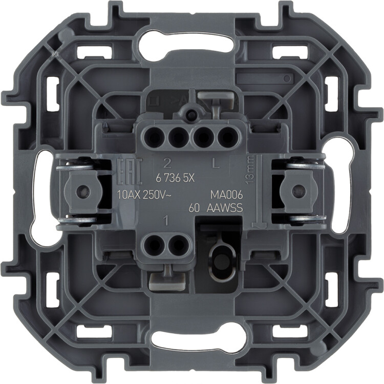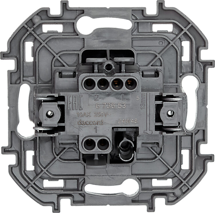 Переключатель одноклавишный скрытого монтажа Legrand/Daccord Inspiria, цвет "Антрацит", номинальный ток 10АХ, напряжение ~250В, безвинтовые зажимы. Устанавливается в жилых и общественных помещениях для управления приборами освещения, вентиляции и т.д. Предназначен для управления одной нагрузкой с одного, двух или более мест (совместно с перекрёстными переключателями). Особенности изделия: - Компактный механизм глубиной всего 20 мм без проблем размещается в монтажных коробках малой глубины - Материал клавиши - АБС: обладает высокой ударопрочностью, стоек к выгоранию и загрязнениям - Материал механизма и суппорта - высококачественный поликарбонат: обладает высокой электробезопасностью, термостабильностью и не поддерживает горение - Все токоведущие части выключателя имеют защиту от случайного прикосновения - Безвинтовые зажимы обеспечивают быстрое присоединение и отсоединение проводов с однопроволочными и многопроволочными жилами - Безвинтовые зажимы не требуют обслуживания, гарантируют надежное и долговечное соединение - Удобные широкие толкатели облегчают отсоединение провода - Улучшенная эргономика снижает вероятность искрения при коммутации светодиодных источников света - Ход клавиши короткий, негромкий