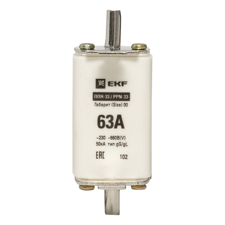 Плавкая вставка ППН-33 160/ 63А габарит 00 EKF. Предохранители плавкие ППН EKF, укомплектованные плавкими вставками типа gG/gL, предназначаются для защиты кабельных линий и промышленных электроустановок от токов перегрузки и короткого замыкания. Предохранители применяются в электрических сетях переменного тока частотой 50 Гц с напряжением до 660В. Применяются для крепления в распределительных и вводно-распределительных устройствах. Предохранители плавкие ППН могут устанавливаться в основание с держателем, а также в специально предназначенные рубильники. В комплект поставки предохранителей плавких ППН основание с держателем не входит и приобретается отдельно.