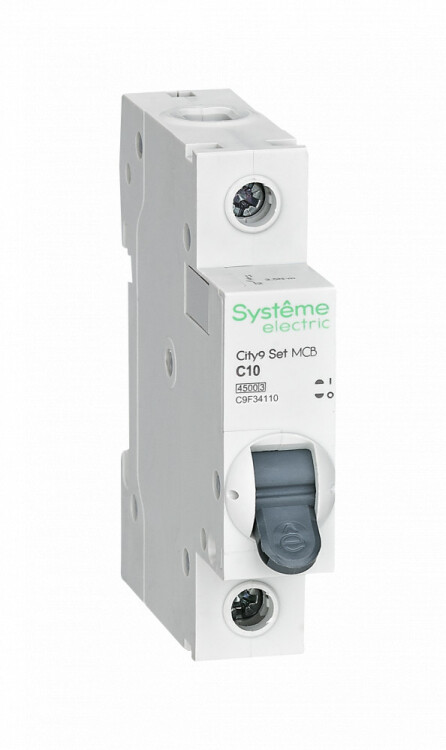 Автоматический выключатель серии City9 Set Systeme Electric, 1-полюсный, номинальный ток 10 А, характеристика С, Icn = 4.5 кА. Применяется в электрических сетях напряжением 230 В. Предназначен для защиты от перегрузок и токов короткого замыкания. Оснащен механизмом «мгновенной коммутации». Ударопрочный корпус из специального пластика с 6 металлическими заклепками. Безопасные клеммы исключают попадание кабелей в заклеммное пространство (ранее Schneider Electric EZ9F34110).