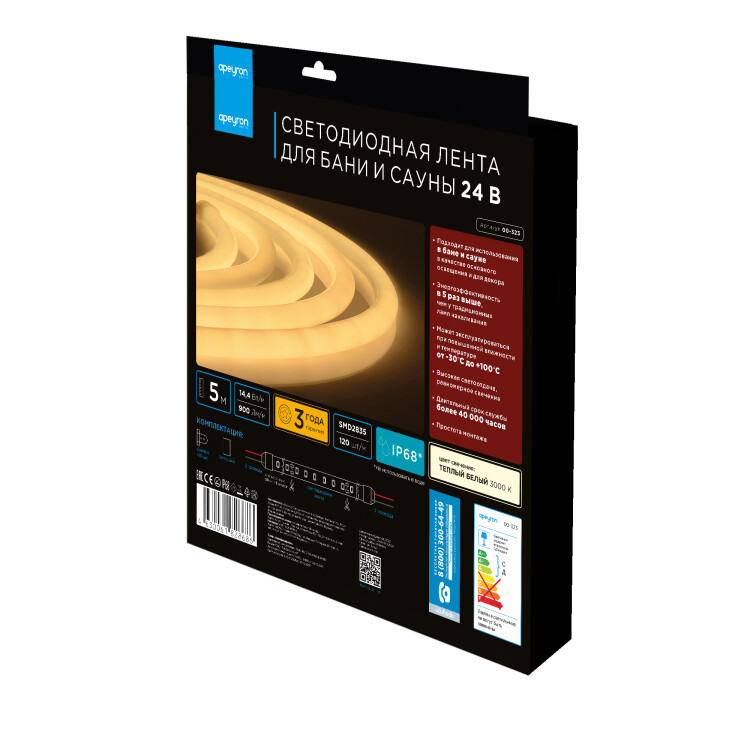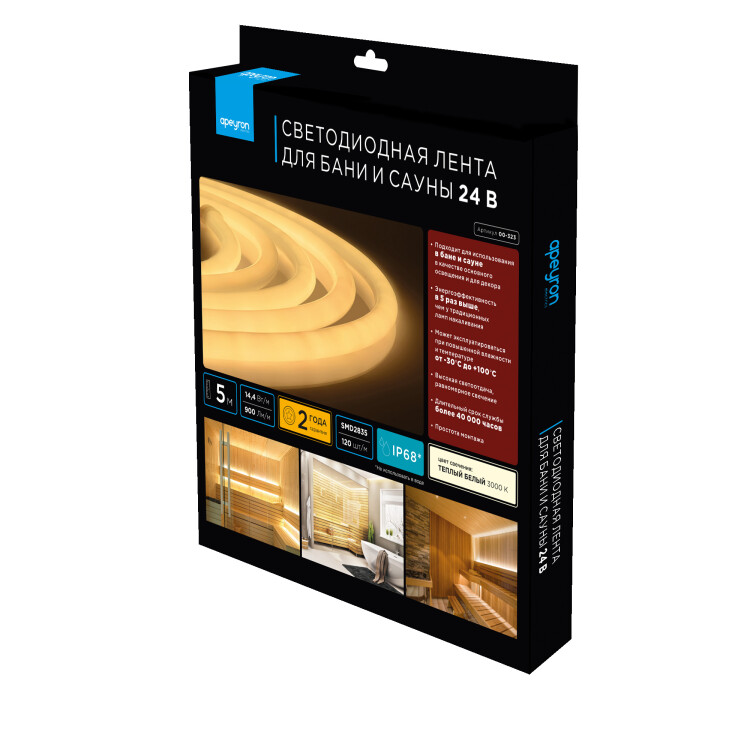 Светодиодная лента для бани и сауны с артикулом 00-323 работает от постоянного тока с напряжением 24В. Благодаря светодиодам smd 2835 излучающим световой поток равный 900 Лм/м лента используется для вспомогательной декоративной подсветки областей интерьерного пространства. Светодиодная лента эквивалентна лампам накаливания мощностью 90 Вт. Данная модель светодиодной ленты обладает теплым белым цветом свечения с цветовой температурой 3000 К. Потребляемая мощность светодиодной ленты равна 14,4 Вт на один метр. Степень защиты этого изделия соответствует стандарту IP68. Герметичная силиконовая оболочка позволяет использовать светодиодную ленту в банях и саунах. Не использовать в воде! Отрезать светодиодную ленту можно через каждые 50 мм. В комплект поставки входит: светодиодная лента 5 м, крепеж 10 шт., заглушки 2 шт. в сборе +1 шт.