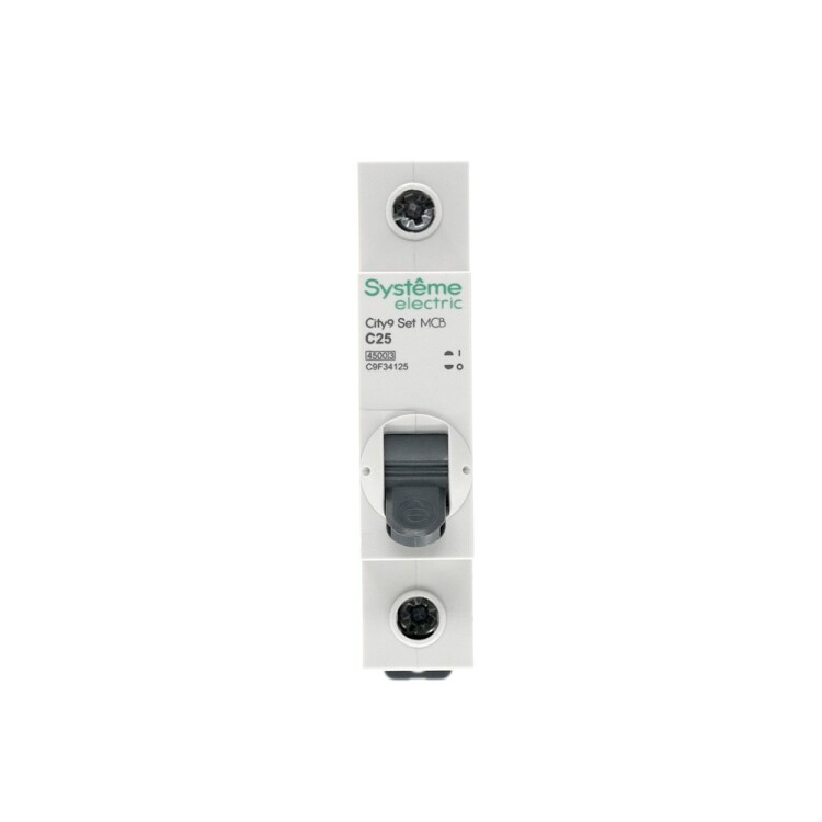 Автоматический выключатель серии City9 Set Systeme Electric, 1-полюсный, номинальный ток 25 А, характеристика С, Icn = 4.5 кА. Применяется в электрических сетях напряжением 230 В. Предназначен для защиты от перегрузок и токов короткого замыкания. Оснащен механизмом «мгновенной коммутации». Ударопрочный корпус из специального пластика с 6 металлическими заклепками. Безопасные клеммы исключают попадание кабелей в заклеммное пространство (ранее Schneider Electric EZ9F34125).