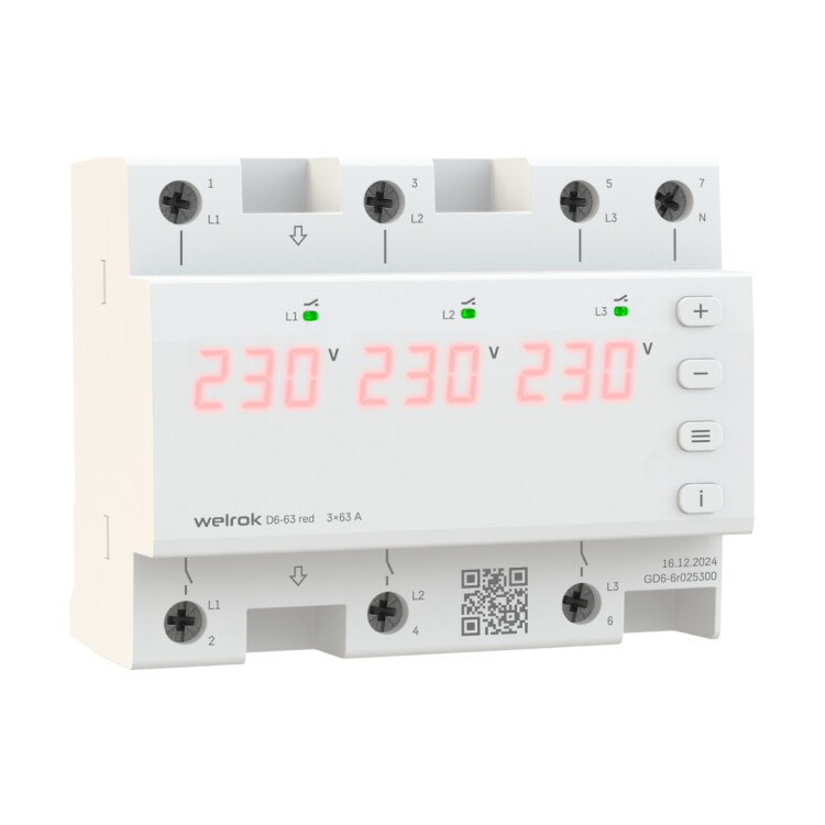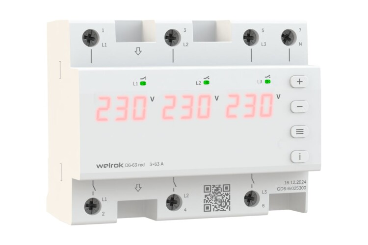 Реле напряжения Welrok D6 red защищает электрооборудование от критических скачков напряжения в сети, занимает 6 модулей и может работать в режиме однофазной или трехфазной нагрузки.