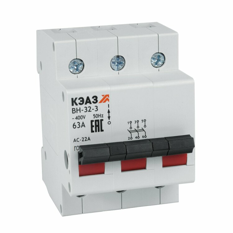 Модульный 3 полюсный выключатель нагрузки переменного тока с предельной коммутационной способностью при переменном токе на номинальный ток 63 А.