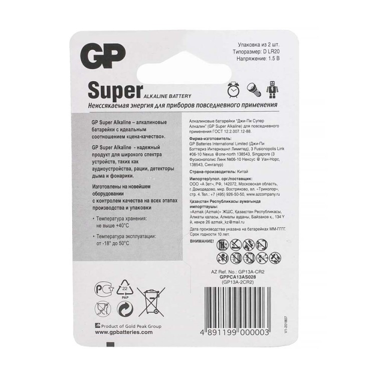 Батарейка алкалиновая "D"/LR20 GP 13AA21-2CRSBC2 D (2 шт.)