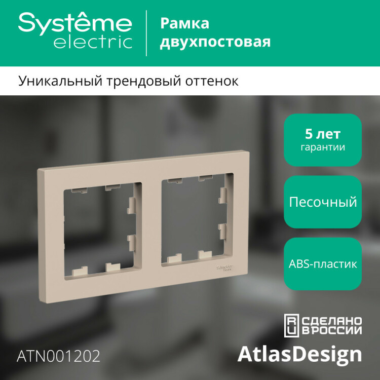 Рамка Systeme Electric (ранее Schneider Electric) серии AtlasDesign в цвете песочный двухместная. Устанавливается в вертикальном и горизонтальном положениях. Лицевые детали из качественного ABS-пластика, устойчивого к царапинам и УФ-излучению. Позволяет гармонично вписать электроустановочное изделие в интерьер помещения.