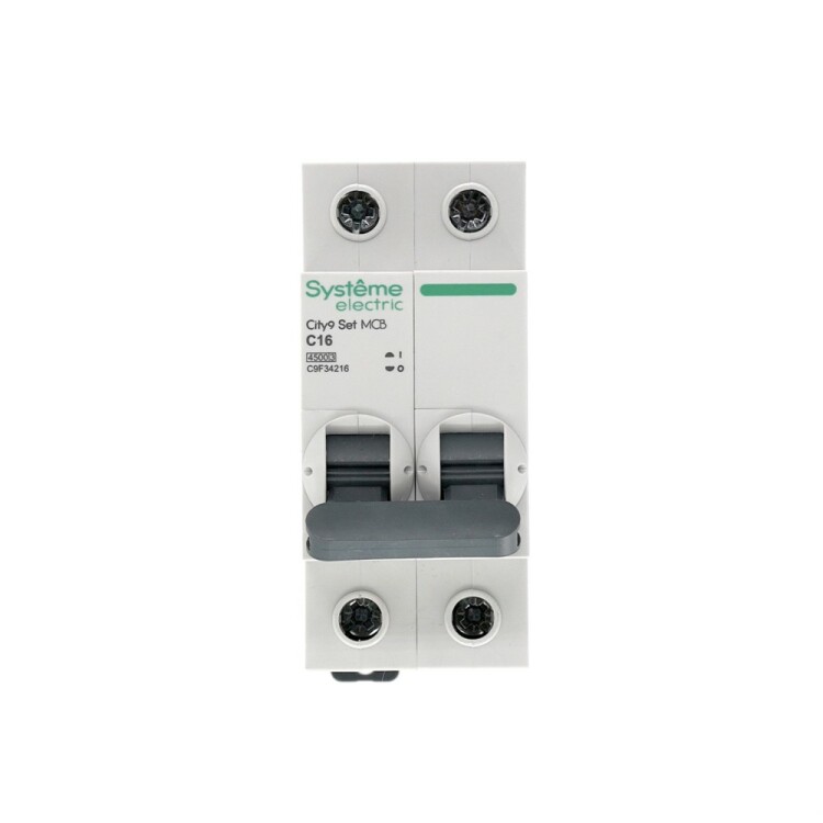 Автоматический выключатель серии City9 Set Systeme Electric, 2-полюсный, номинальный ток 16 А, характеристика С, Icn = 4.5 кА. Применяется в электрических сетях напряжением 230 В. Предназначен для защиты от перегрузок и токов короткого замыкания. Оснащен механизмом «мгновенной коммутации». Ударопрочный корпус из специального пластика с 6 металлическими заклепками. Безопасные клеммы исключают попадание кабелей в заклеммное пространство (ранее Schneider Electric Easy9 EZ9F34216).