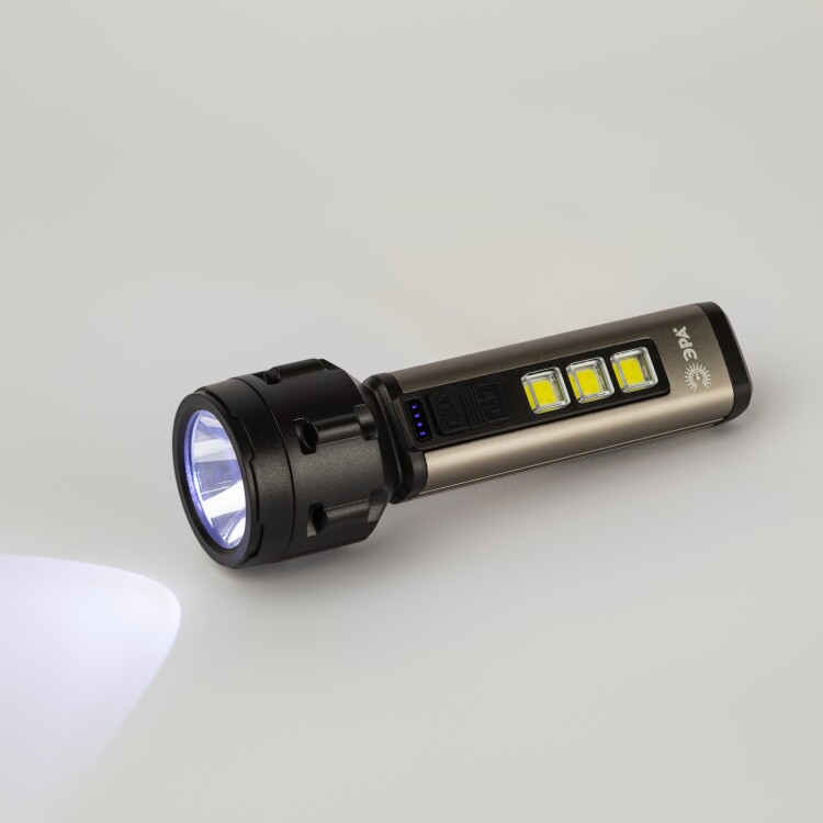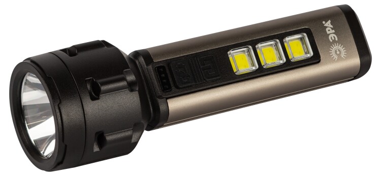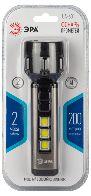 ЭРА UA-601 «Прометей» - аккумуляторный ручной фонарь с мощным 3-сегментным боковым светильником. Уникальный для российского рынка дизайн. Яркий головной луч (1 SMD-светодиод) дальностью до 200 метров помогает качественно освещать дорогу или подсвечивать конкретные предметы. Боковой светильник, состоящий из 3 компактных, но очень ярких COB-матриц с инновационными микросветодиодами, формирует широкое заливающее освещение. Ручка фонаря изготовлена из алюминия. Новый LED-фонарь имеет эргономичную конструкцию и комфортно лежит в руке. Кнопки включения прорезинены и приятны на ощупь. Ёмкий литиевый аккумулятор 800 мАч отлично держит заряд. Для подзарядки фонаря необходимо подключить адаптер с выходным напряжением 5 В постоянного тока в разъему micro-USB фонаря с помощью USB кабеля, идущего в комплекте. После полной подзарядки фонарь светодиодный ЭРА «Прометей» непрерывно светит 2 часа. Есть индикатор заряда. Ручной фонарь отличается повышенным световым потоком – 420 Лм. Выпускается в презентабельной блистерной упаковке.