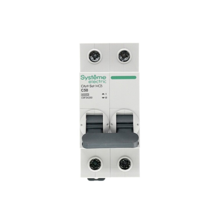 Автоматический выключатель серии City9 Set Systeme Electric, 2-полюсный, номинальный ток 50 А, характеристика С, Icn = 4.5 кА. Применяется в электрических сетях напряжением 230 В. Предназначен для защиты от перегрузок и токов короткого замыкания. Оснащен механизмом «мгновенной коммутации». Ударопрочный корпус из специального пластика с 6 металлическими заклепками. Безопасные клеммы исключают попадание кабелей в заклеммное пространство (ранее Schneider Electric Easy9 EZ9F34250).