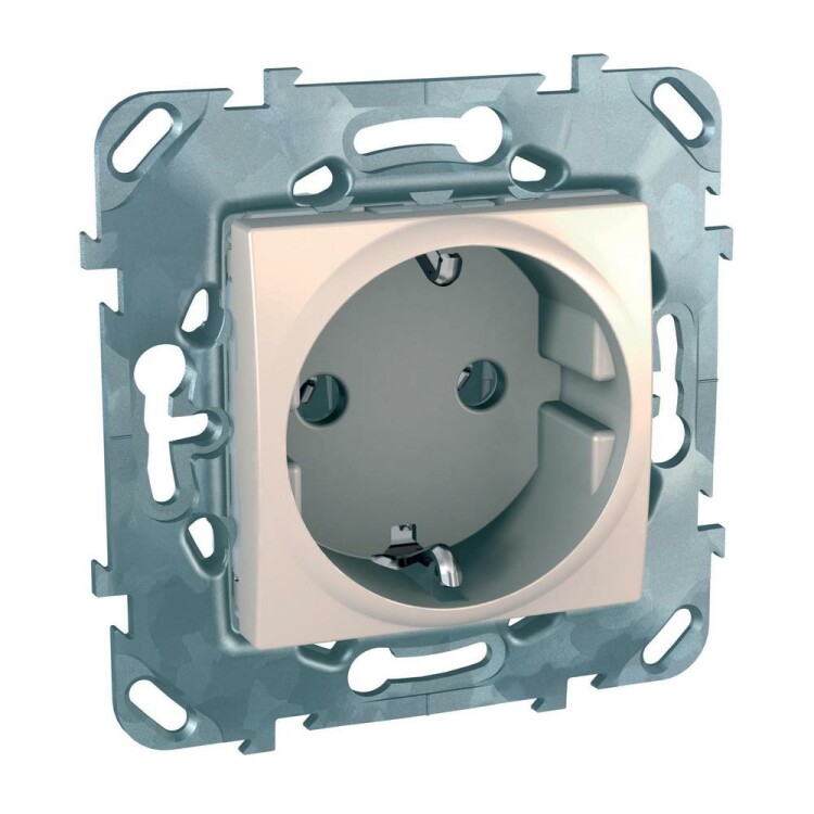 Розетка Schneider Electric UNICA (бежевый) с заземлением, без шторок предназначена для сетей до 250 В на ток до 16 А.