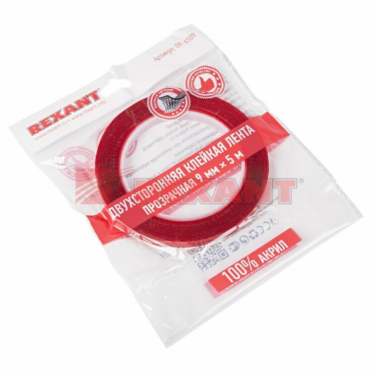 REXANT Двухсторонний скотч прозрачный 100% акрил, защитная пленка красного цвета 9мм 5м.
