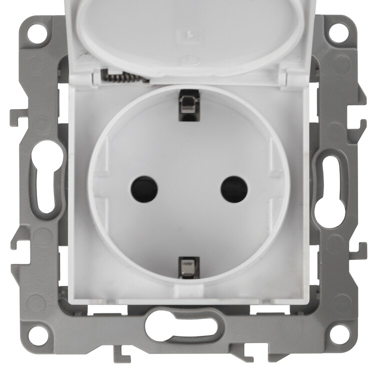 Розетка с заземлением со шторками с крышкой серии Эра 12 скрытой уст. механизм цвет белый 12-2103-01. Номинальные хар-ки 16А 250В . Сделана из поликарбоната, оснащёна автоматическими клеммами для быстрй и надёжной фиксации жил кабеля в механиме. Парные клеммы обеспечивают соединение шлейфом. Монтаж в подрозетник производится и на лапки, и на винты.
