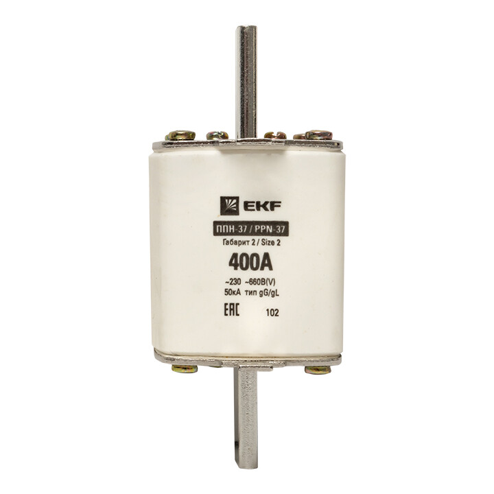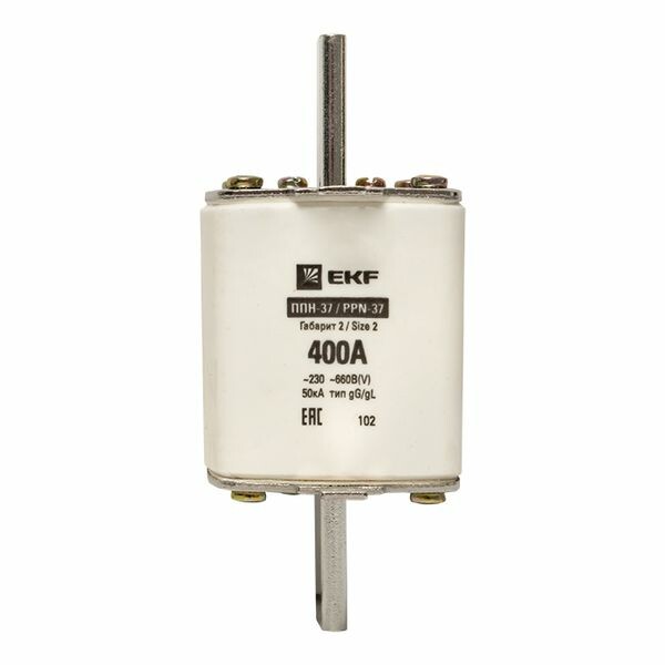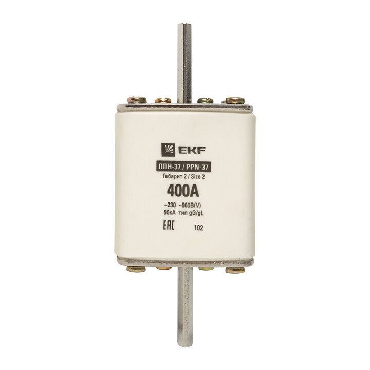 Плавкая вставка ППН-37 400/400А габарит 2 EKF. Предохранители плавкие ППН EKF, укомплектованные плавкими вставками типа gG/gL, предназначаются для защиты кабельных линий и промышленных электроустановок от токов перегрузки и короткого замыкания. Предохранители применяются в электрических сетях переменного тока частотой 50 Гц с напряжением до 660В. Применяются для крепления в распределительных и вводно-распределительных устройствах. Предохранители плавкие ППН могут устанавливаться в основание с держателем, а также в специально предназначенные рубильники. В комплект поставки предохранителей плавких ППН основание с держателем не входит и приобретается отдельно.