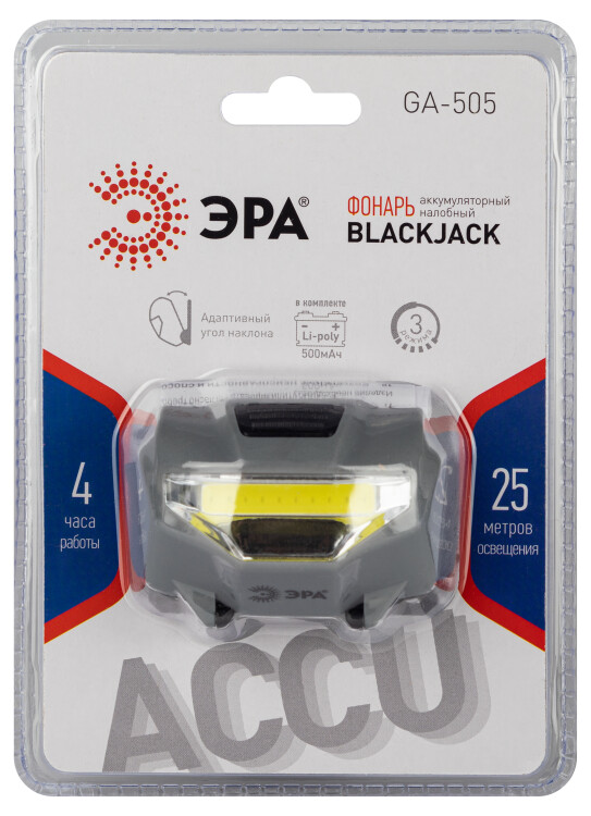 Хит продаж – фонарь ЭРА «Блэкджек» - теперь и с аккумулятором. ЭРА GA-505 «Блэкджек» – мощный аккумуляторный налобник для работы, походов, бытовых дел. Новый светодиодный налобный фонарь от торговой марки ЭРА работает в 3 режимах: максимальная яркость, 50% яркости и аварийное мигание. Яркая светодиодная плата создает широкое заливающее освещение. Максимальная дальность – 25 метров. Наклонный корпус позволяет регулировать угол освещения в зависимости от выполняемых работ. Благодаря прочному эластичному ремешку налобный LED-фонарь отлично держится на голове. Корпус из легкого прочного пластика. Удобная кнопка включения. В основе фонаря налобного – современные светодиоды последнего поколения. Емкий литиевый аккумулятор позволяет фонарю светить без перерыва 4 часа. Налобник хорошо работает как в мороз (-20С°), так и в жару (+45С°). Имеет аккуратный универсальный дизайн и компактные размеры. Удобный в применении, долговечный, яркий налобник на все случаи жизни.