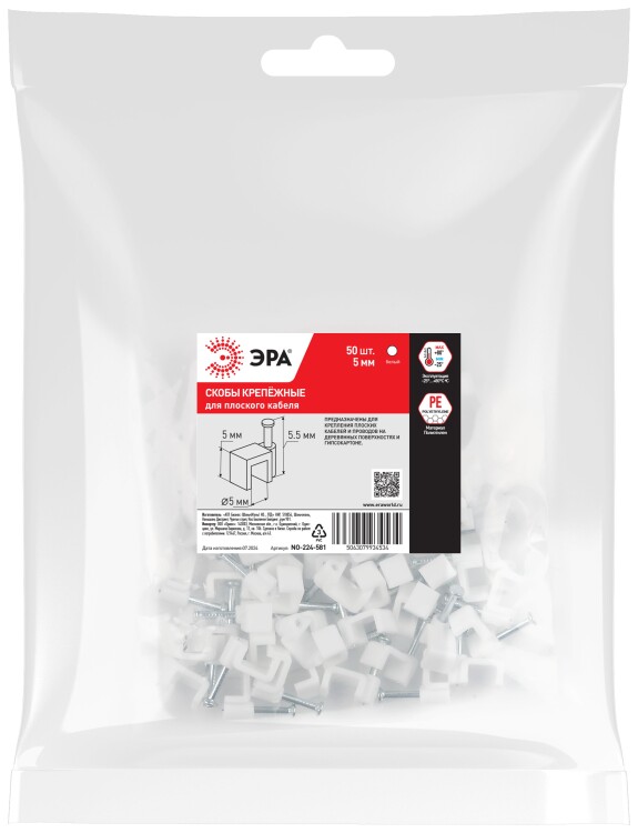 Скобы крепёжные пластиковые ЭРА предназначены для быстрого и надежного крепления круглых и плоских кабелей.