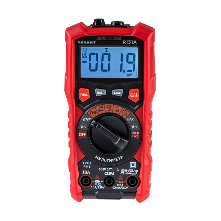 Портативный цифровой мультиметр R131A REXANT представляет собой современное устройство, которое позволяет измерить переменный ток, произвести тест батарей и аккумуляторов до 12В, определить фазу и нейтраль.Мультиметр имеет автоматический выбор диапазонов измерений. Оснащен бесконтактным детектором напряжения NCV.Параметры измерений:Постоянное напряжение: 400мВ/4В/40В/400В/600В ± (0.5%)Переменное напряжение: 400мВ/4В/40В/400В/600В ± (1.0%)Постоянный ток: 40мА/400мA ± (1.2%) 10A ± (1.2%)Переменный ток: 40мА/400мA ± (1.5%) 10A ± (1.5%)Сопротивление: 400 Ом/4кОм/40кОм/400кОм/4MОм/40MОм ± (1.0%)Емкость: 4нф/40нф/400нф/4мкф/40мкф/400мкф/4мф ± (4.0%)Основные функции и особенности:Автоматический выбор пределов измеренийРежим максимальныx измерений (MAX)Функция памяти данныx DATA HOLDРежим "прозвонка", диод- тестСветовая и звуковая индикация нейтрали/фазы (LIVE TEST)Бесконтактный детектор напряжения NCV с индикациейТест батарей: 1,5В/9В/12ВРазрядность дисплея: 4000 отсчетовКоличество измерений в секунду: 3Функция подсветки рабочей области и дисплеяЗащитный кожуx, крепеж щупов, подставкаАвтоматическое отключение питания через 15 минутБатареи: 1,5 В ААА, 2 шт.Вес с батареями: 230 гГабариты: 151x52x48 ммКомплект поставки: мультиметр, измерительные щупы, батареи, инструкция