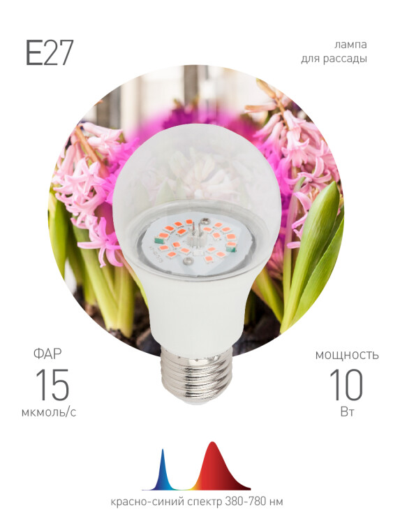 Фитолампа для растений светодиодная FITO-10W-RB-E27-K мощностью 10 Вт прекрасный выбор для комнатных растений, а также зелени, капусты, помидоров и хризантем. Поместите светильник на оптимальном расстоянии до 10 см от верхушек и наслаждайтесь настоящим оазисом без ущерба зрению. Приятный светло-розовый оттенок будет заливать пространство в радиусе до полуметра. Коэффициент пульсаций менее 10%: неприятное мерцание исключено. Фитолампа для растений светодиодная имеет красно-синий спектр, а значит Ваши растения будут получать все необходимые вещества для быстрого роста, здоровой корневой системы и процесса фотосинтеза. Кроме того, прозрачная колба увеличивает эффективность потребления почти вдвое по сравнению с матовым оформлением. Фитолампа для растений светодиодная одинаково подойдет как для освещения уже взрослых растений, так и для рассады. Использование в помещении без естественных источников освещения не повлияет на работоспособность лампочки.Добавьте в свой интерьер свежести и красоты вместе с фитосветильником красно-синего спектра от компании ЭРА.
