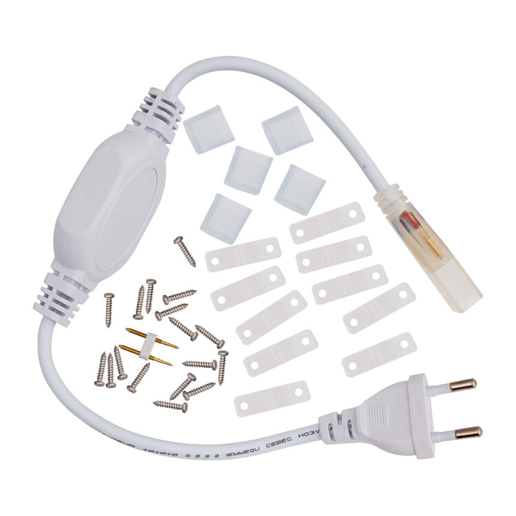 Монтажный комплект 03-41 для высоковольтной одноцветной светодиодной ленты предназначен для тех случаев, когда осветительную систему не хочется перегружать массивными источниками питания. Используется для подключения ленты к сети 230 В: один конец светодиодной ленты подключают к разъемам коннектора, с другой стороны устанавливают заглушку с целью изоляции открытых контактов. Также, при дополнительной герметизации силиконом, коннектор шнура питания обеспечивает степень защиты от пыли и влаги на уровне IP44 в месте соединения. Подходит для ленты 220 В со светодиодами smd2835 в количестве 60 диодов на 1 метр. Максимальное метраж подключаемой ленты – 100 м. Изделие демонстрирует стойкость к перепадам температур и воздействию ультрафиолетовых лучей. В комплекте: крепеж (10 шт.), заглушки (5 шт.), шнур питания с диодным мостом (1 шт.). Фиксаторы и заглушки выполнены из прозрачного ПВХ, шнур питания – из белого пластика. Длина шнура питания 50 см. Сила тока 4 А. Размер контакта 6 мм.